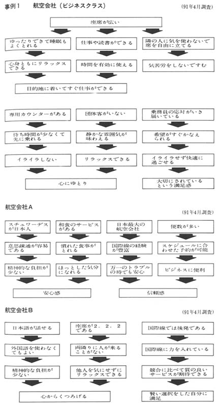 さて、「スイートスポットが2倍」のクラブや“バイシン”、ウエハースにはもちろん別の消費者価値やベネフィットのはしごがあり、逆に「優越感」「女王気分」「良い母親」という消費者価値にも別のはしごがある。1つの商品・銘柄は複数のはしごを持つが、それを4つのレベルに整頓し、系統図としてまとめあげるのがラダリングであると言える。 たとえば、「航空会社のビジネスクラス」は「座席が広い」という商品属性から3つの客観的ベネフィットと3つの主観的ベネフィット、そして1つの消費者価値を導いているし、「ビジネスクラス」にはこのほかに「専用カウンターがある」「団体客がいない」「乗務員の応対が行き届いている」などの商品属性から始まるラダーも挙げられている。こうしたラダーの系統図がラダリング・システムのアウト・プットなのである。 |